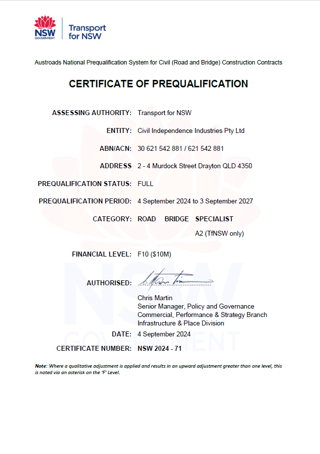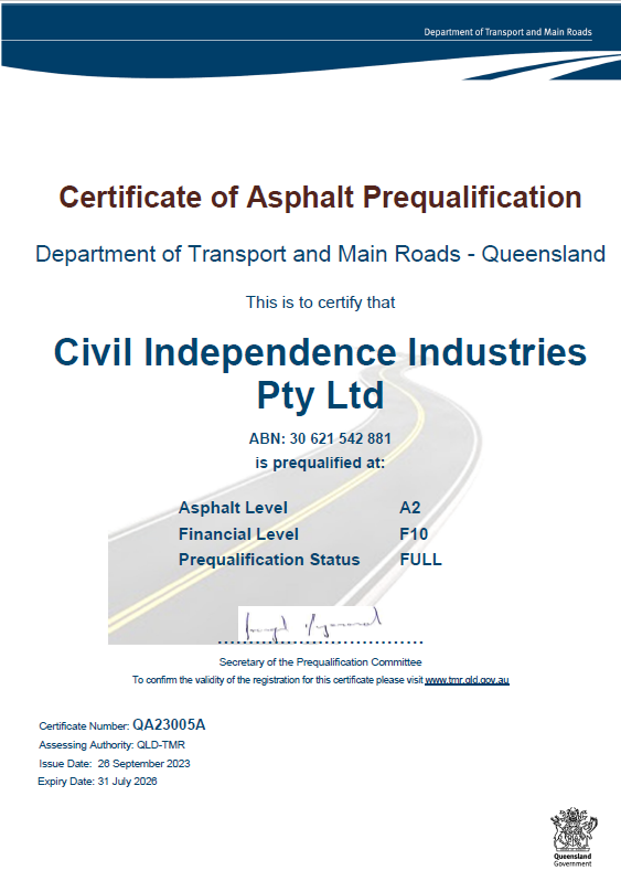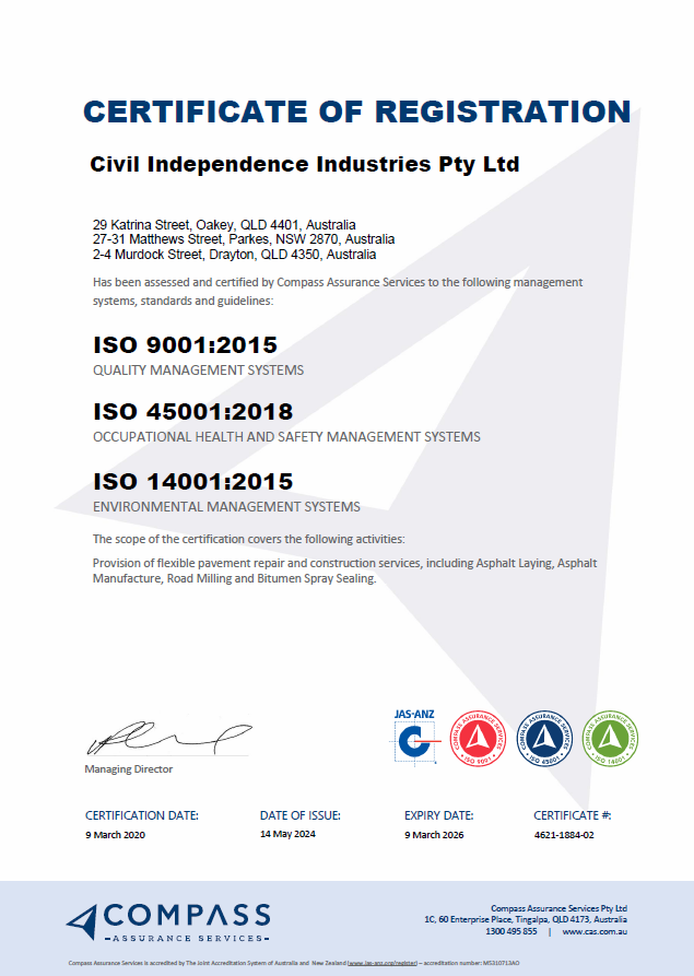 CII is an accredited asphalt contractor with the Department of Transport and Main Roads (DTMR) and Transport for NSW (TfNSW). CII operates under a certified Integrated Management System to the following management systems, standards and guidelines: Quality Management Systems ISO 9001:2015; Occupational Health and Safety Management Systems AS/NZS 4801:2001 and Environmental Management Systems ISO 14001:2015.